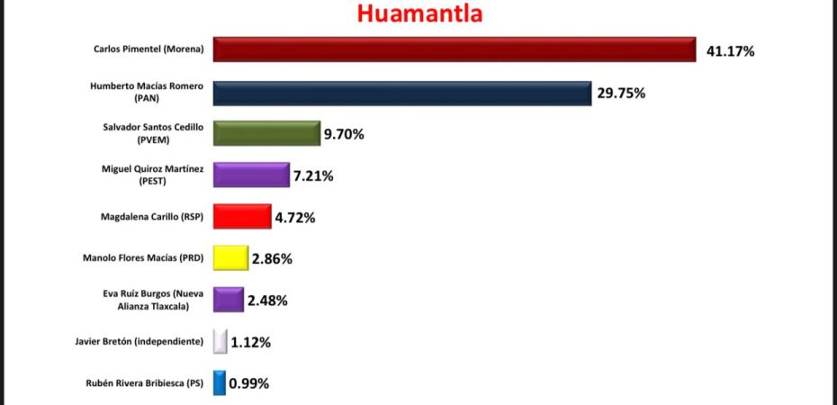 Mientras tanto para el pueblo mágico de Tlaxcala y uno de los más importantes en la entidad y a nivel nacional por su famosa feria y su arte efimero, la encuesta da el triunfo a Carlos Pimentel con un 41.17 por ciento de la intención del voto, seguido por el PAN con un 29.75 por ciento y el Verde Ecologista con solo un 7.88 por ciento.
