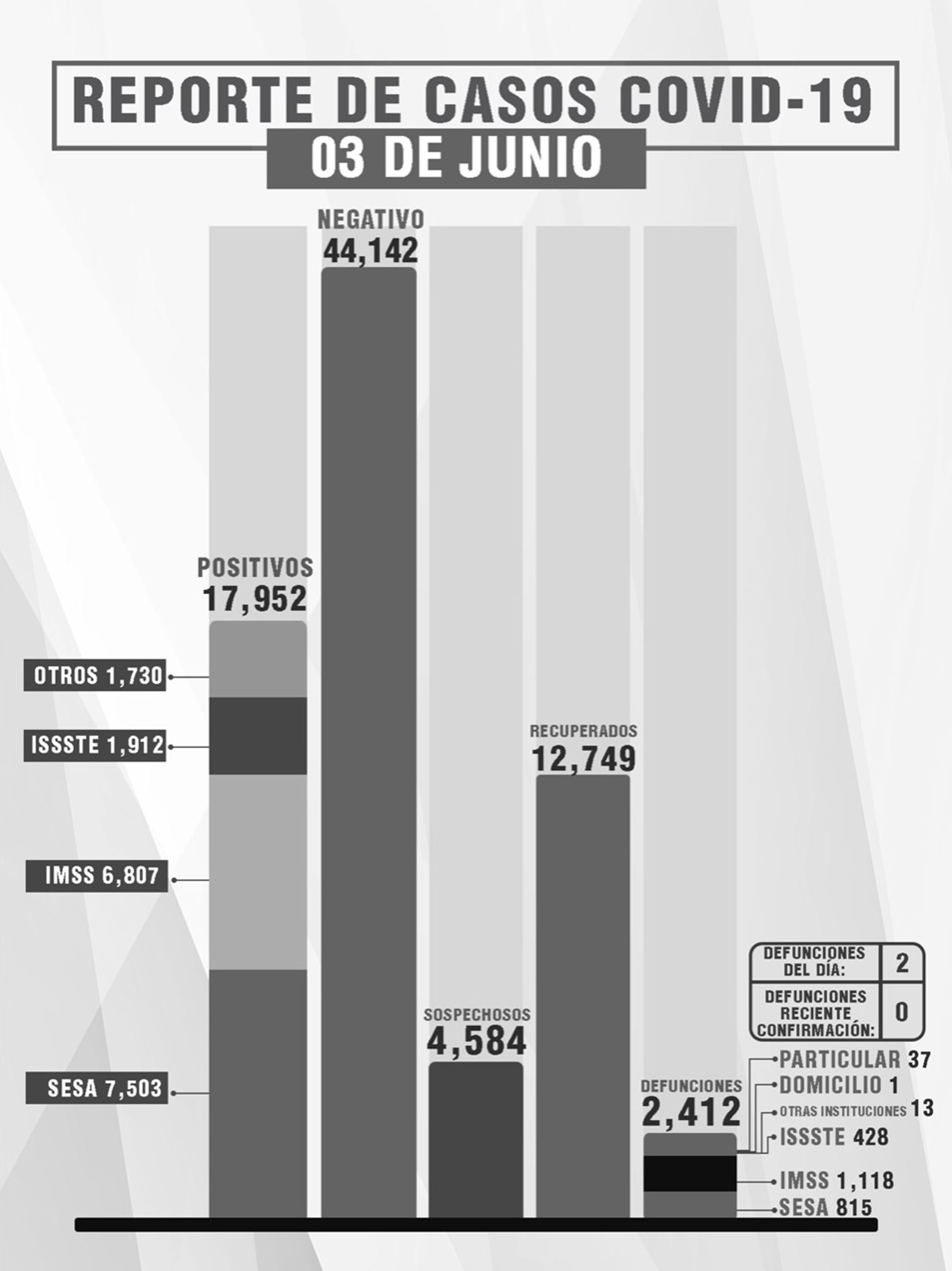 De esta manera, el estado registra 12 mil 749 personas recuperadas, 17 mil 952 casos positivos y dos mil 412 fallecimientos.