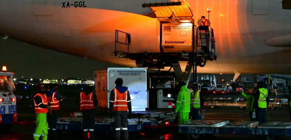 El vuelo 6R 501 de la aerolínea AeroUnion, procedente de Chicago, Illinois, Estados Unidos, llegó a la terminal 1 del Aeropuerto Internacional de la Ciudad de México (AICM) “Benito Juárez”. Participaron 42 elementos del Ejército Mexicano en el arribo, traslado y seguridad de las vacunas.