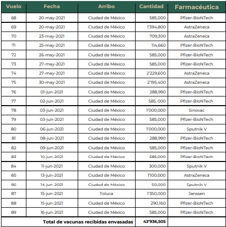 México ha recibido 43 millones 936 mil 505 dosis de vacunas envasadas de Pfizer-BioNTech, AstraZeneca, Sinovac, Centro Nacional de Investigación de Epidemiología y Microbiología Gamaleya, CanSino Biologics y Johnson & Johnson. Asimismo, en nuestro país, el laboratorio Drugmex ha