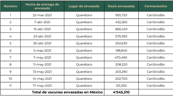 envasado cuatro millones 545 mil 310 dosis de CanSino Biologics, lo que hace un total de 48 millones 481 mil 815 dosis.