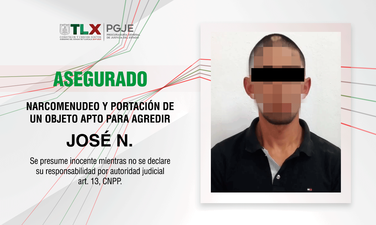 Por lo que, al estar ante un delito flagrante, la persona quien dijo llamarse José N., de 28 años de edad, fue asegurado y puesto a disposición del Agente del Ministerio Público por delitos contra la salud en su modalidad de narcomenudeo.