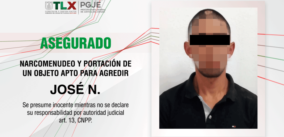 Por lo que, al estar ante un delito flagrante, la persona quien dijo llamarse José N., de 28 años de edad, fue asegurado y puesto a disposición del Agente del Ministerio Público por delitos contra la salud en su modalidad de narcomenudeo.