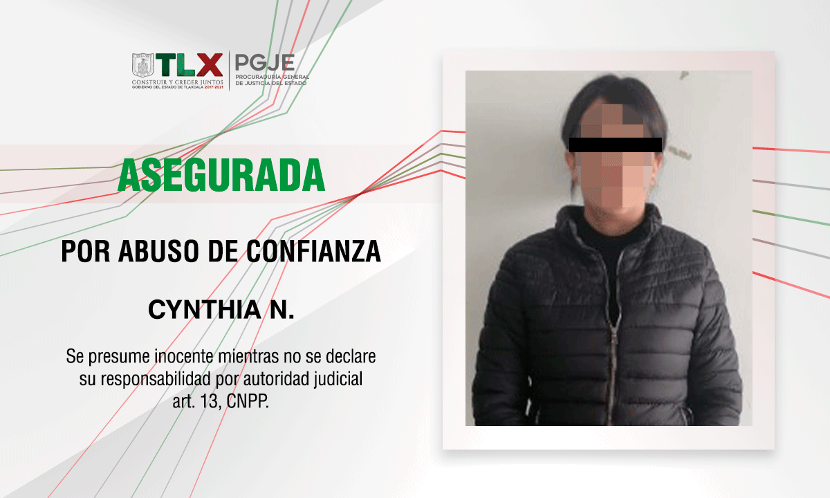 Oficiales de la Policía de Investigación adscritos a la Procuraduría General de Justicia del Estado (PGJE) cumplimentaron una orden de aprehensión en contra de Cynthia N., por el delito de abuso de confianza, ya que se apoderó de la cantidad de 43 mil 915 pesos cuando se desempeñó como empleada de una sociedad cooperativa.
