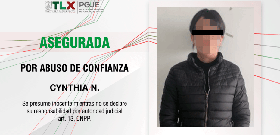 Oficiales de la Policía de Investigación adscritos a la Procuraduría General de Justicia del Estado (PGJE) cumplimentaron una orden de aprehensión en contra de Cynthia N., por el delito de abuso de confianza, ya que se apoderó de la cantidad de 43 mil 915 pesos cuando se desempeñó como empleada de una sociedad cooperativa.