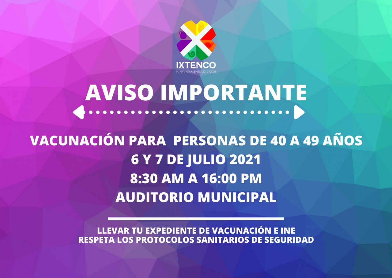 La Secretaría de Bienestar, a través del Gobierno Municipal de Ixtenco informó que los días; martes 6 y miércoles 7 de julio, se llevará a cabo la aplicación de la primera dosis de la vacuna para las personas de 40 a 49 años de edad y para mujeres embarazadas con más de 9 semanas de gestación.
