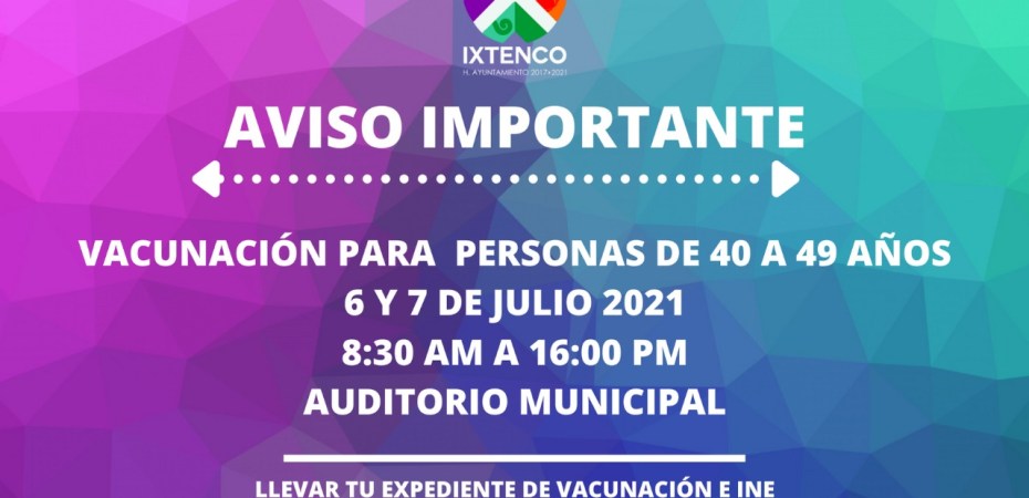 La Secretaría de Bienestar, a través del Gobierno Municipal de Ixtenco informó que los días; martes 6 y miércoles 7 de julio, se llevará a cabo la aplicación de la primera dosis de la vacuna para las personas de 40 a 49 años de edad y para mujeres embarazadas con más de 9 semanas de gestación.