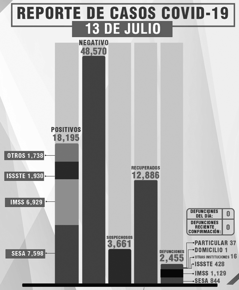 De esta manera, el estado registra 12 mil 886 personas recuperadas, 18 mil 195 casos positivos y dos mil 455 fallecimientos.