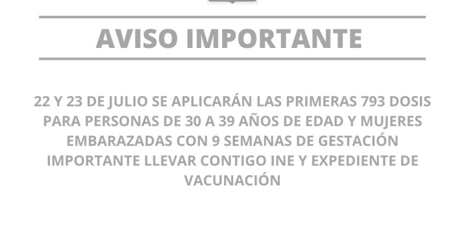 El próximo jueves 22 y viernes 23 de julio, se aplicarán las primeras 793 dosis de la vacuna a los grupos de edad de 30 a 39 años y mujeres embarazadas con más de 9 semanas de gestación.