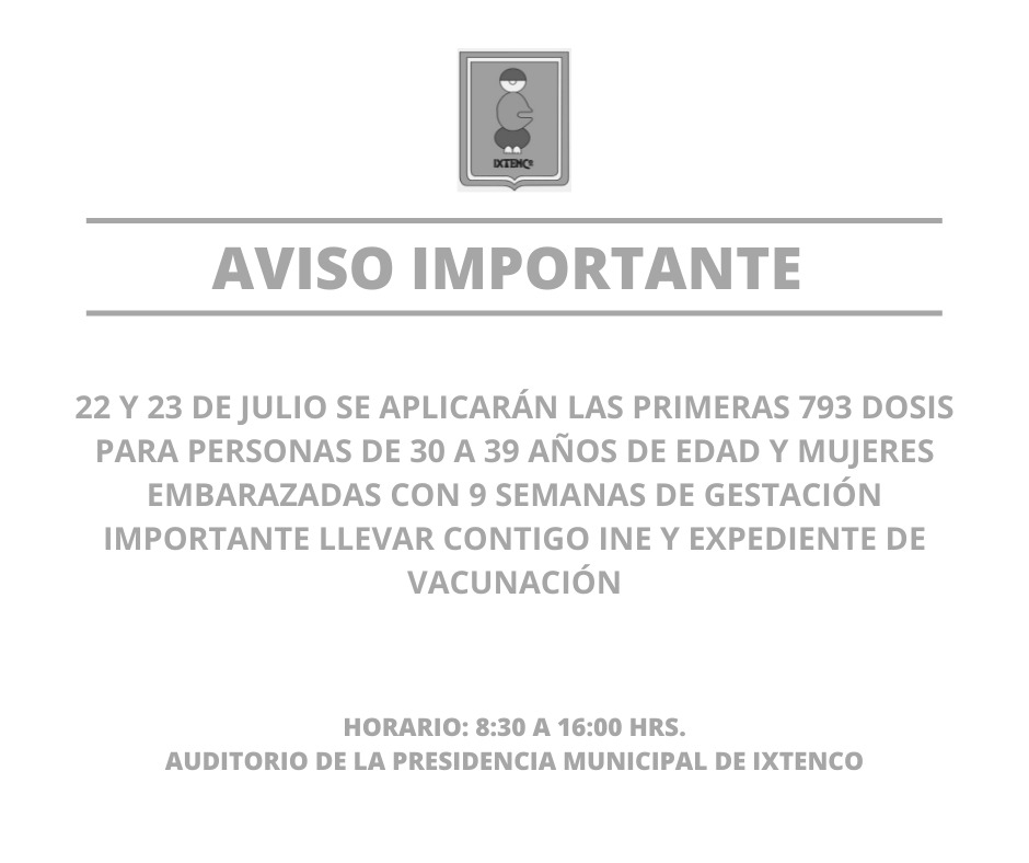 La vacuna será aplicada en el auditorio de la Presidencia Municipal de Ixtenco, a partir de las 8:30 horas y hasta las 16 horas.