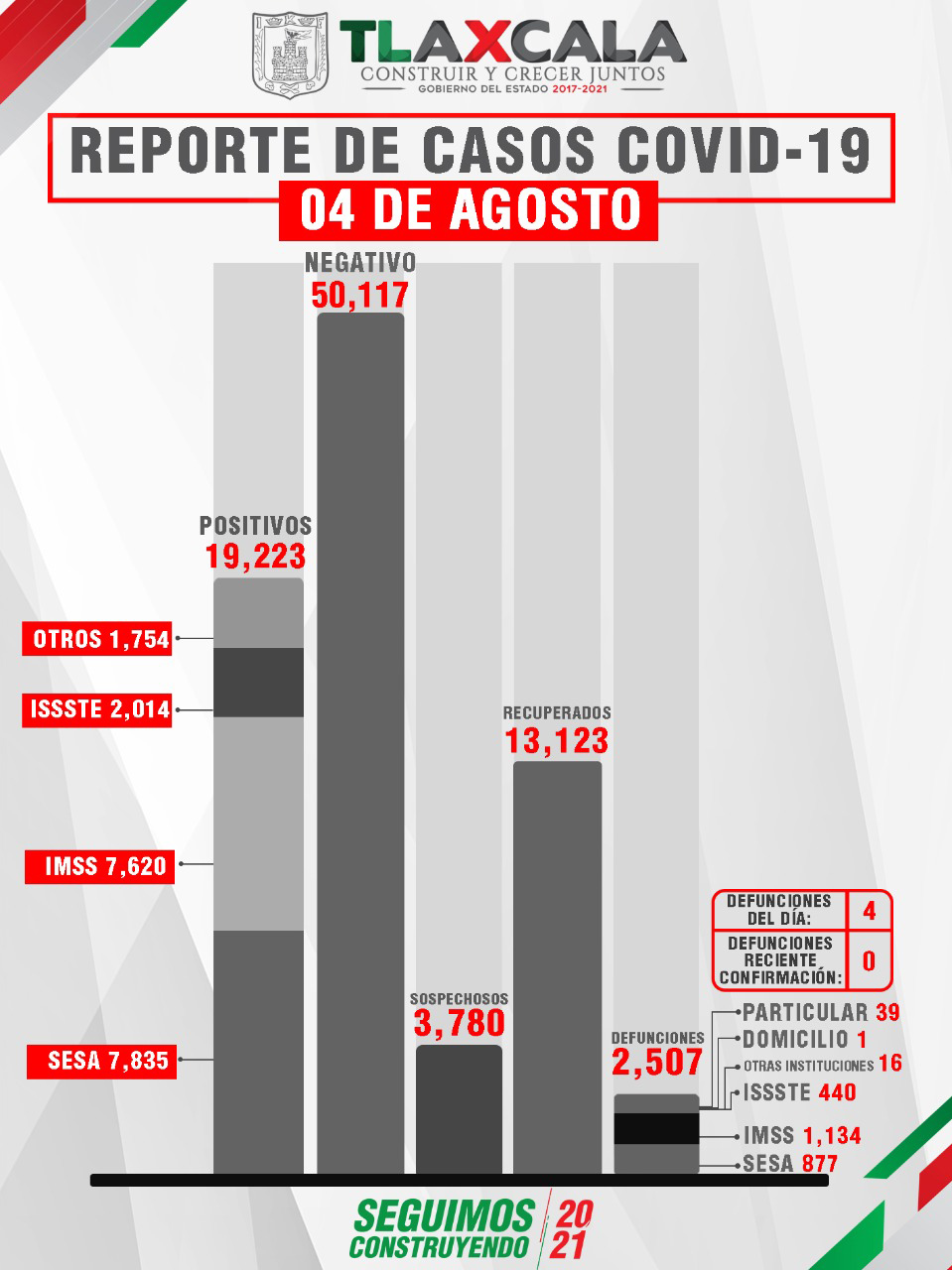 De acuerdo con el reporte del 04 de agosto, la Secretaría de Salud del Estado (SESA) confirmó 27 personas recuperadas, cuatro fallecimientos y 73 casos positivos de Covid-19 de tlaxcaltecas identificados en el estado y tres en otras entidades.