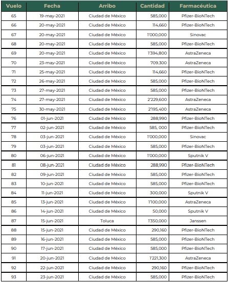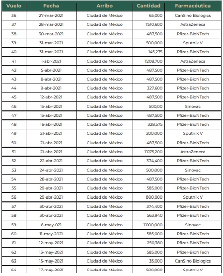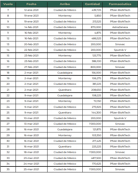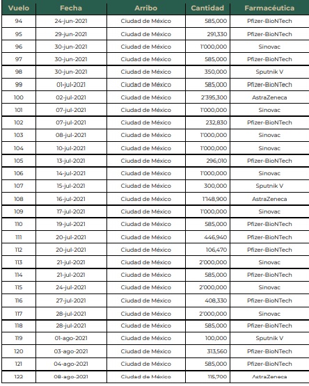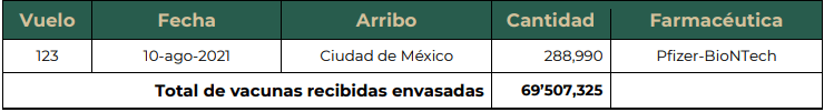 México ha recibido 69 millones 507 mil 325 dosis de vacunas envasadas de Pfizer-BioNTech, AstraZeneca, Sinovac, Centro Nacional de Investigación de Epidemiología y Microbiología Gamaleya, CanSino Biologics y Johnson & Johnson.