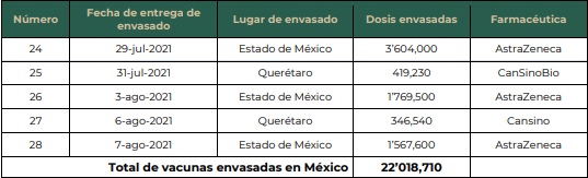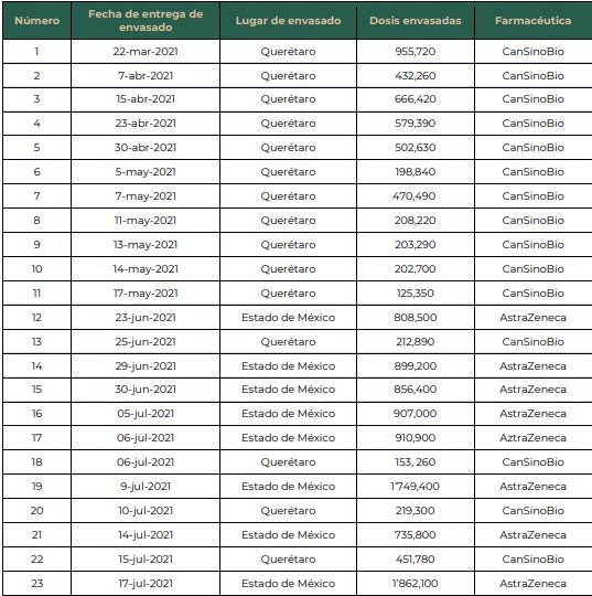 Asimismo, en territorio mexicano, el laboratorio Drugmex ha envasado seis millones 348 mil 310 dosis de CanSino Biologics, y el laboratorio Liomont otros 15 millones 670 mil 400 biológicos de AstraZeneca, lo que hace un total de 22 millones 018 mil 710 vacunas envasadas en el país.