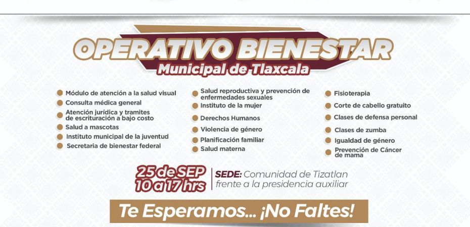 Este programa dará comienzo a partir del próximo 25 de septiembre y hasta el 4 de diciembre, en horarios de atención de 10 de la mañana a 5 de la tarde, comenzando en la comunidad de Tizatlán, enfrente del edificio de presidencia.