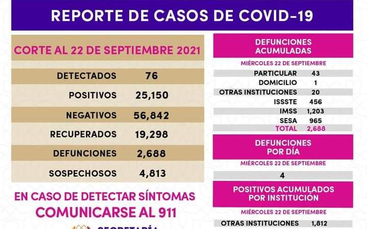 La SESA, a través de los datos registrados en la plataforma nacional del Sistema de Vigilancia Epidemiológica de Enfermedades Respiratorias (Sisver), confirmó 76 casos positivos de Covid-19 y cuatro defunciones el miércoles 22 de septiembre de 2021.
