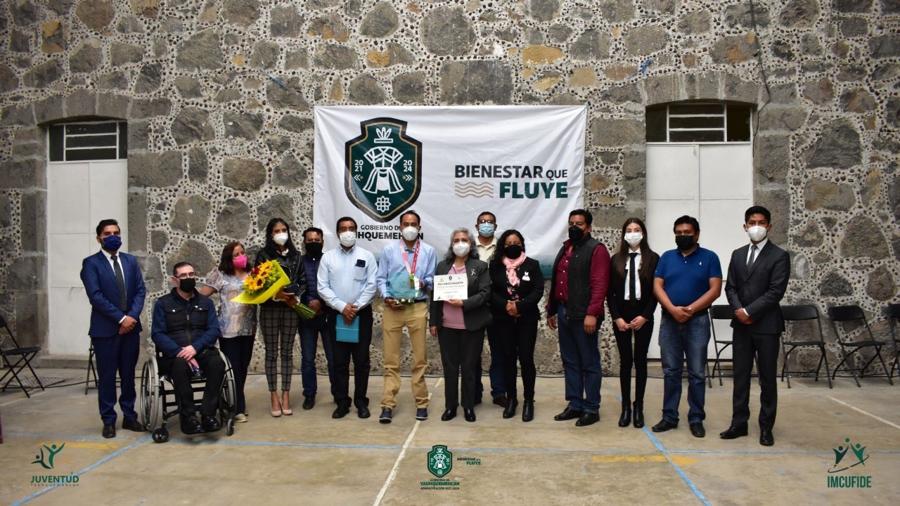 Al finalizar, las autoridades municipales de Yauhquemehcan entregaron a Leonardo de Jesús Pérez un reconocimiento por su participación y triunfo en los Juegos Paralímpico de Tokio 2020, donde obtuvo medalla de bronce en atletismo en la prueba de 100 metros T52.