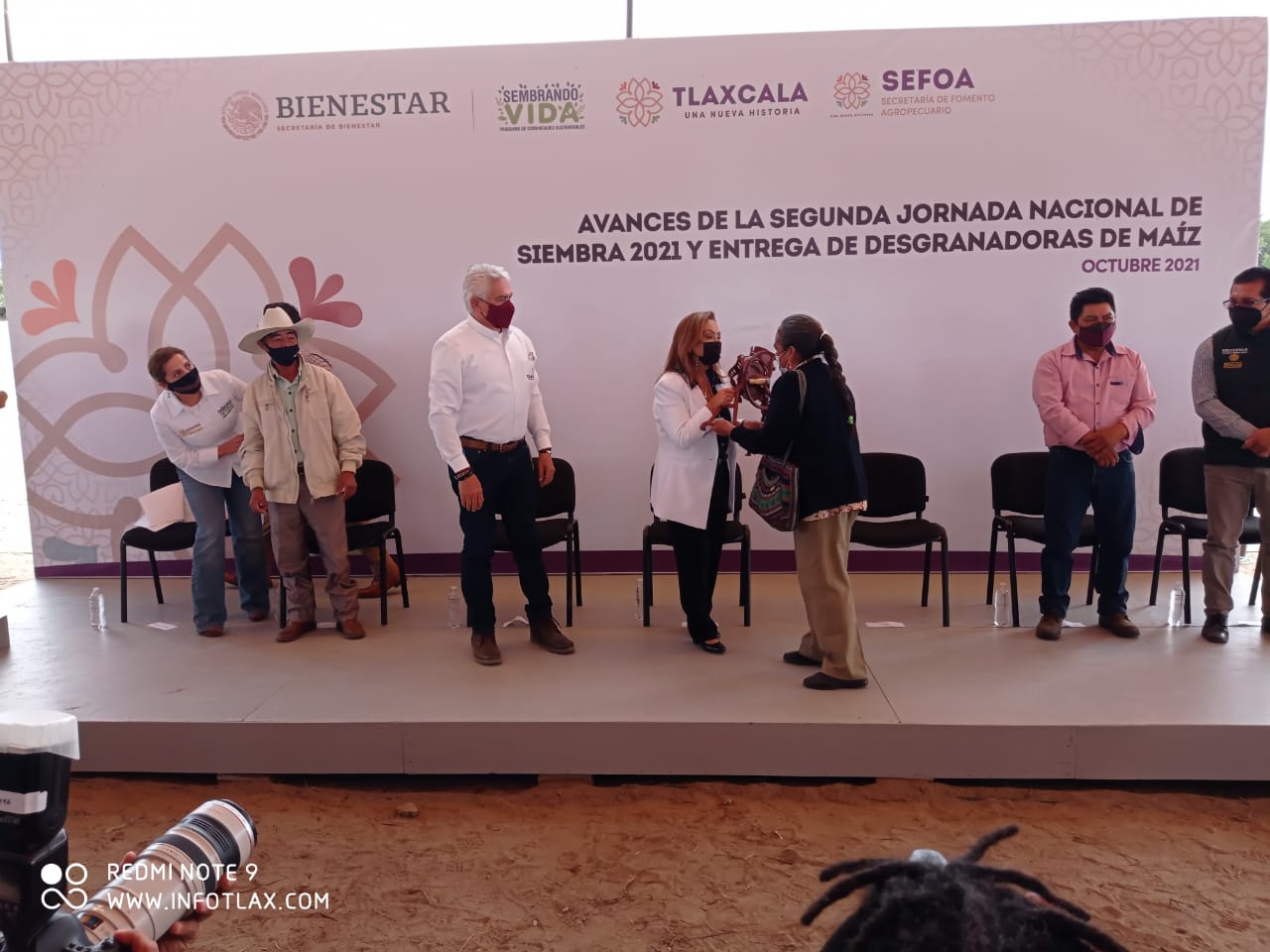 La gobernadora de Tlaxcala, Lorena Cuéllar Cisneros, entregó desgranadoras a cien campesinos y supervisó el avance de la segunda jornada de siembra “Desde el Corazón de Nuestra Tierra” del programa Sembrando Vida, acompañada del delegado de Bienestar, Carlos Luna Vázquez.