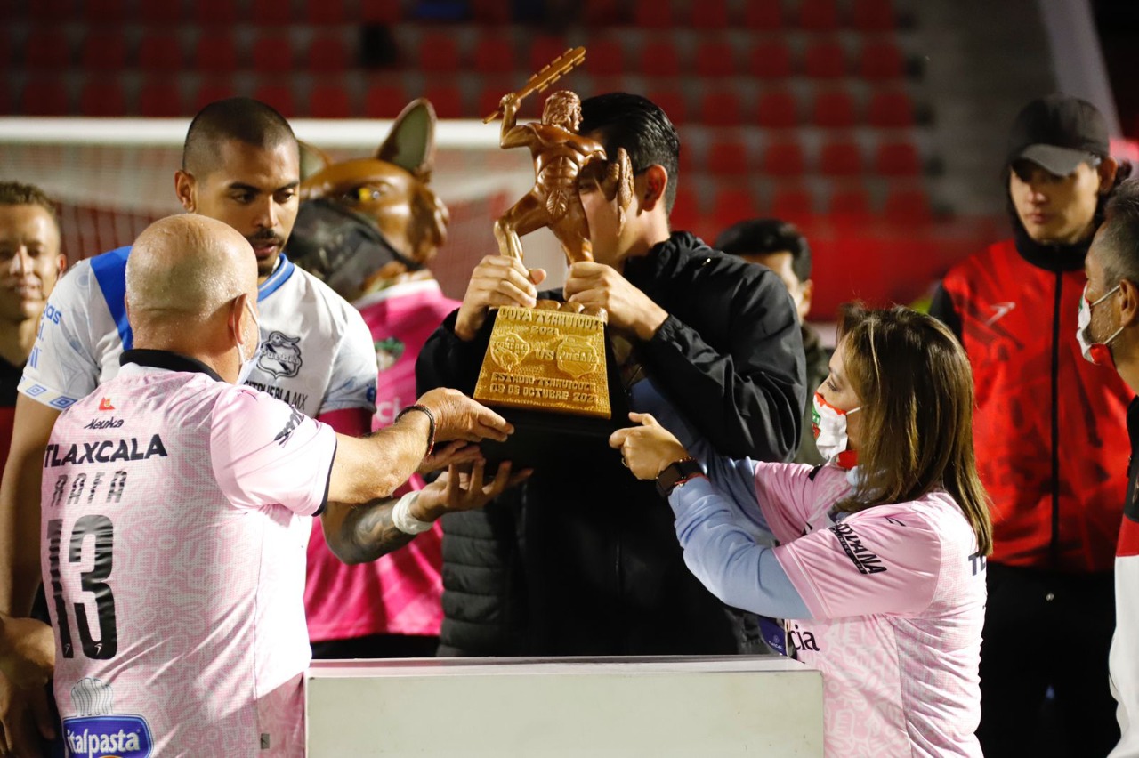 La gobernadora de Tlaxcala, Lorena Cuéllar Cisneros entregó la «Copa Tlahuicole» edición 2021 a los ganadores del partido amistoso disputado la noche de ayer entre los equipos de fútbol Coyotes Tlaxcala y el Puebla de La Franja.