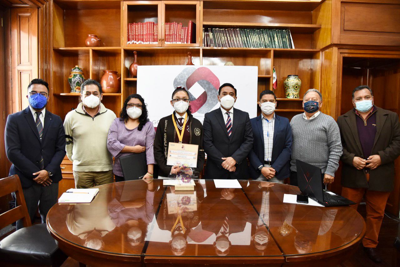 El presidente municipal de Tlaxcala, Jorge Corichi, recibió en su despacho a Myrahis Yurizahan Sanluis Cerezo, alumna de la Escuela Secundaria Técnica No 36, que presentará su proyecto “Realidad aumentada como herramienta didáctica en la educación” en BUCA International Music, Science Energy & Engineering Fair 2021, que se realizará en forma remota, teniendo como sede Turquía.