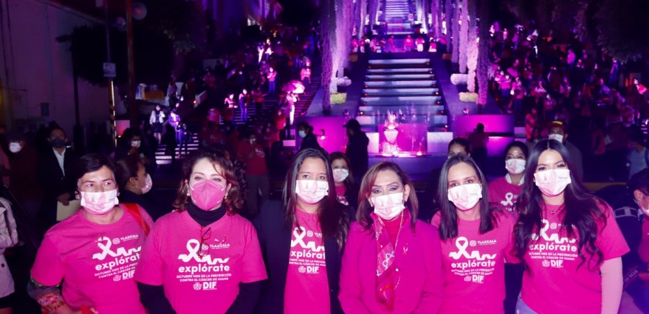 La gobernadora Lorena Cuéllar Cisneros, junto con la presidenta honorífica y la directora del Sistema Estatal para el Desarrollo Integral de la Familia (Sedif), Mariana Espinosa de los Monteros Cuéllar y Laura García Sánchez, respectivamente, encendieron la iluminación en color rosa de las Escalinatas de los Héroes en la capital tlaxcalteca, como parte de las actividades de la lucha contra el cáncer de mama.