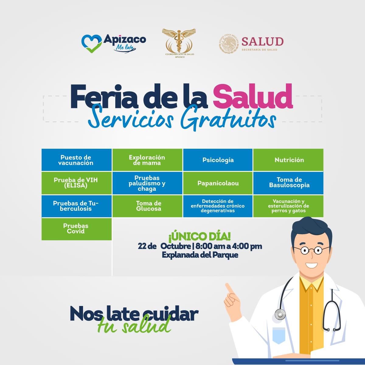 El Gobierno de Apizaco, a través de la Dirección Municipal de Salud, invita a la ciudadanía a acudir a la Feria de la Salud, el próximo viernes 22 de octubre en el Parque Cuauhtémoc, de 8 de la mañana a 4 de la tarde, ¡único día!