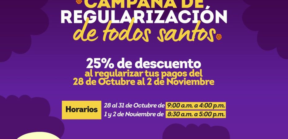 El Gobierno de Apizaco dio a conocer la campaña de regularización de Todos los Santos, que consiste en un descuento del 25 por ciento en predios del Panteon Municipal, del 28 de octubre al 2 de noviembre