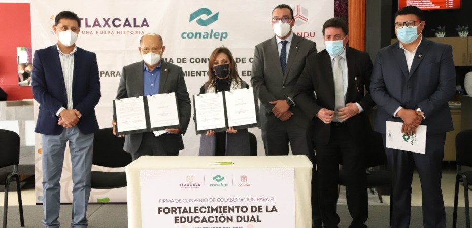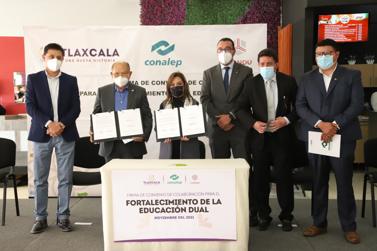 La gobernadora Lorena Cuéllar Cisneros y el director general del Colegio Nacional de Educación Profesional Técnica (Conalep), Enrique Ku Herrera, encabezaron la firma del Convenio de Colaboración para el Fortalecimiento de la Educación Dual entre el subsistema de Tlaxcala y la empresa Coindu de México.