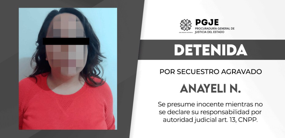 La Procuraduría General de Justicia del Estado (PGJE) a través de los datos de prueba aportados por el Agente del Ministerio Público, consiguió que la autoridad judicial correspondiente vinculara a proceso a Anayeli N., por el delito de secuestro agravado en contra de un hombre en el municipio de Atltzayanca.
