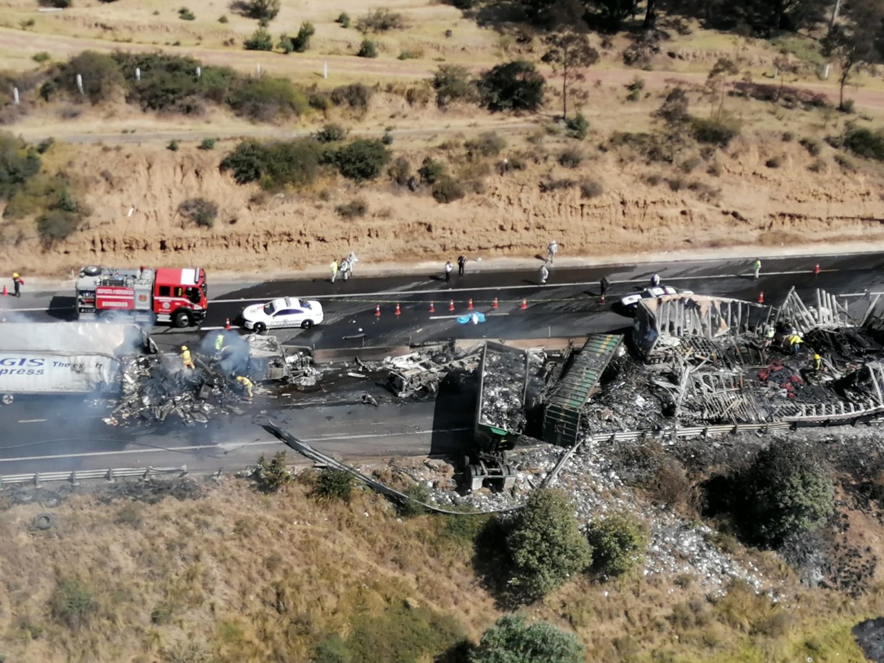 Al mismo tiempo, se reportó que las unidades involucradas en el accidente transportaban contenedores de plástico, mezclilla y materiales para construcción. El fuego los consumió en su totalidad.