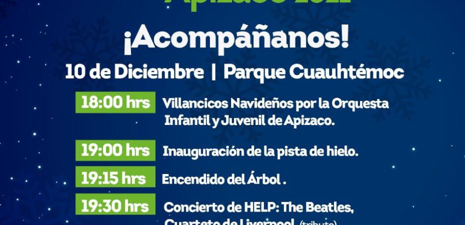 A las 18:00 horas, arranca el cartel con la presentación de Villancicos Navideños a cargo de la orquesta infantil y juvenil de Apizaco, y una hora más tarde quedará inaugurada una pista de hielo que se ubicará en el parque Cuauhtémoc del centro de la ciudad, completamente gratis