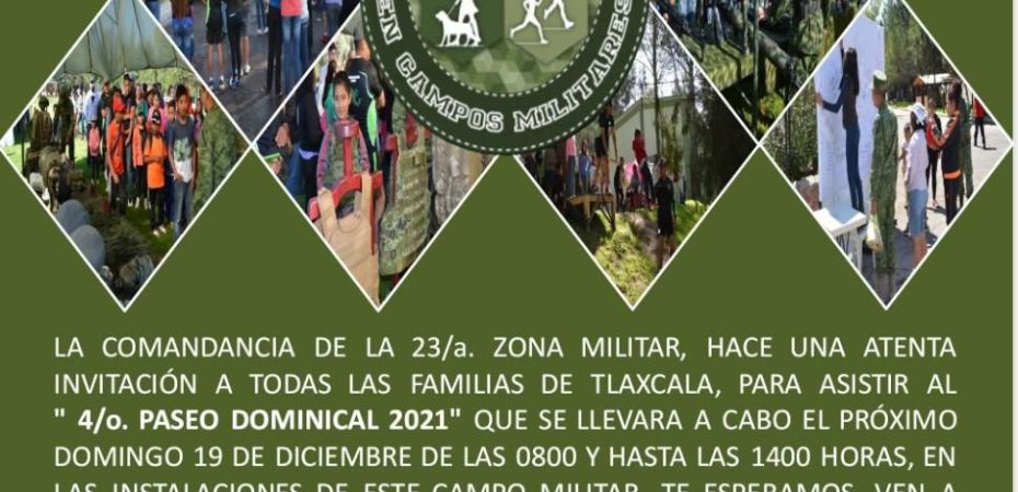 La Secretaría de la Defensa Nacional (Sedena), a través de la comandancia de la 23 Zona Militar con sede en el municipio de Panotla, abrirá nuevamente sus puertas e invita a las familias tlaxcaltecas a participar en el “Cuarto paseo dominical 2021”, a desarrollarse el próximo domingo 19 de diciembre en un horario de 8:00 a 14:00 horas, la actividad tiene como principal objetivo acercarse al público en general.