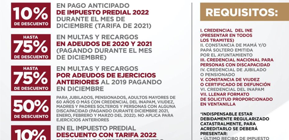 Para los contribuyentes jubilados, pensionados, adultos mayores de 60 años o más con credencial del INAPAM, en situación de viudez, madres y padres solteros y personas con discapacidad, podrán acceder a descuentos de hasta 50% por concepto del impuesto predial en el ejercicio 2022, durante los meses de: diciembre 2021, enero, febrero y marzo del 2022, no aplicable para ejercicios anteriores.