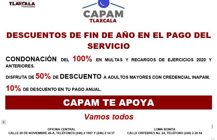 La Comisión de Agua Potable y Alcantarillado del Municipio de Tlaxcala (CAPAM) invita a los contribuyentes a aprovechar los descuentos de fin de año en el pago del servicio de agua potable.