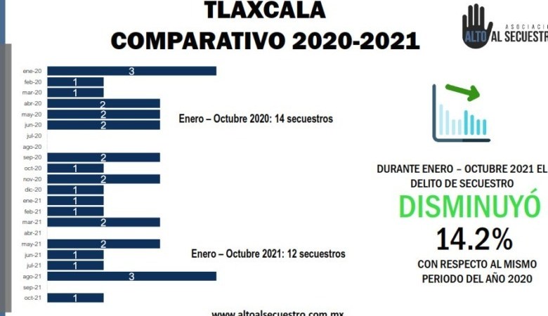 Durante el pasado mes de noviembre, Tlaxcala no presentó ningún secuestro, según cifras de la organización Alto al Secuestro, lo que reafirma que es el estado más seguro del país.