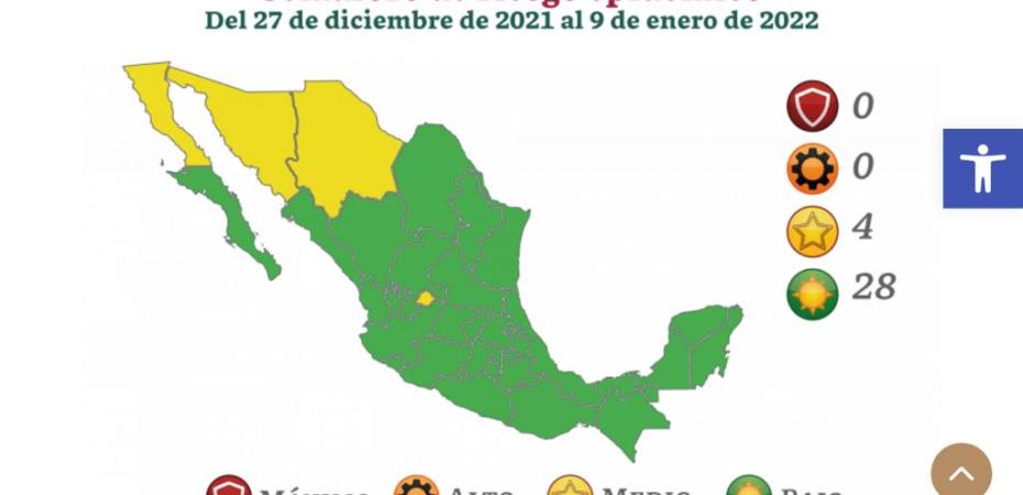 Con la nueva metodología de estimación de riesgo epidémico de la Secretaría de Salud federal, del 27 de diciembre del presente año al 9 de enero de 2022, ningún estado del país estará en semáforo naranja, ni rojo, cuatro entidades estarán en amarillo y los 28 estados restantes se mantendrán en color verde.