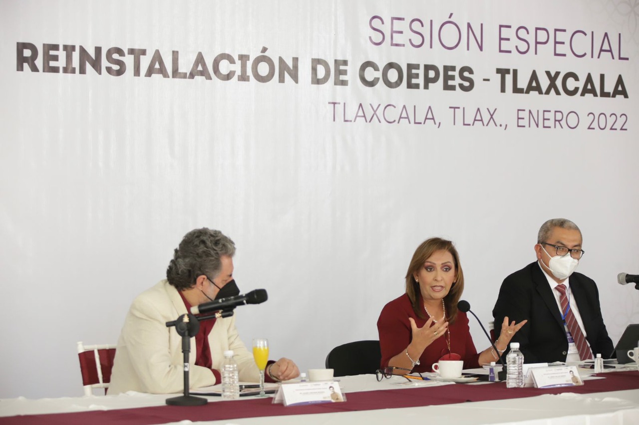 La gobernadora Lorena Cuéllar Cisneros y el subsecretario de Educación Superior de la Secretaría de Educación Pública (SEP), Francisco Luciano Concheiro Borquéz, en representación de la titular de la dependencia federal, Delfina Gómez Álvarez, encabezaron la sesión especial de reinstalación del Consejo Estatal para la Coordinación de la Educación Superior (Coepes), celebrada en Tlaxcala capital.