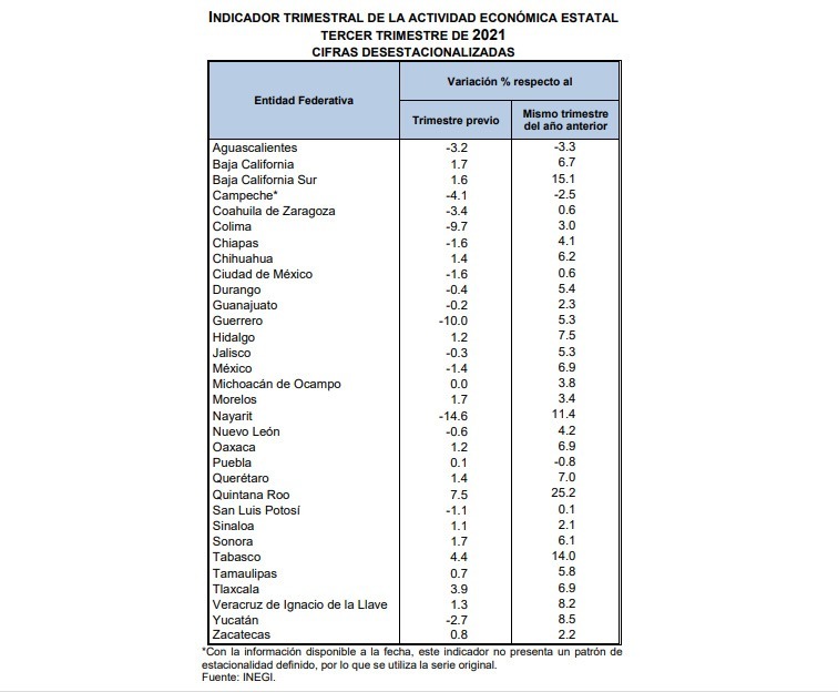 El instrumento refiere que los estados que más crecieron entre julio y septiembre del 2021 fueron Quintana Roo con un 7.5 por ciento, Tabasco 4.4 por ciento, Tlaxcala 3.9 por ciento, Baja California, Morelos y Sonora 1.7 por ciento, y Baja California Sur 1.6 por ciento, con cifras desestacionalizadas.