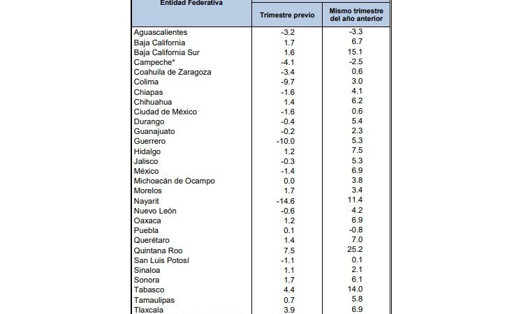 En este sentido, las economías con crecimientos significativos fueron Quintana Roo con 25.2 por ciento, Baja California Sur 15.1 por ciento, Tabasco 14.0 por ciento, Nayarit 11.4 por ciento, Yucatán 8.5 por ciento, Veracruz 8.2 por ciento, Hidalgo con 7.5 por ciento, Querétaro con 7.0 por ciento; y Tlaxcala, Estado de México y Oaxaca con 6.9 por ciento.