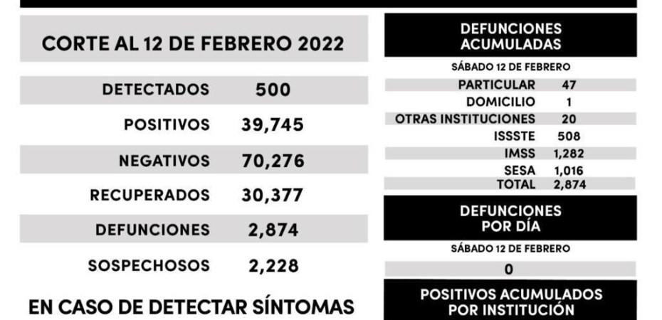 Los datos de la SESA registrados en la plataforma nacional del Sistema de Vigilancia Epidemiológica de Enfermedades Respiratorias (Sisver), confirmaron 500 casos positivos de Covid-19 y cero defunciones, el 12 de febrero de 2022 en la entidad.