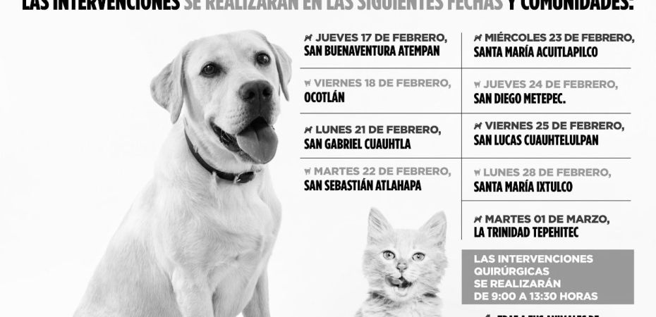 Las intervenciones quirúrgicas en perros y gatos se realizarán en un horario de 9:00 a 13:30 horas en las instalaciones de las presidencias de comunidad antes señaladas.