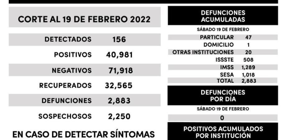 Los datos de la SESA registrados en la plataforma nacional del Sistema de Vigilancia Epidemiológica de Enfermedades Respiratorias (Sisver), confirmaron 156 casos positivos de Covid-19 y cero defunciones, el 19 de febrero de 2022 en la entidad.
