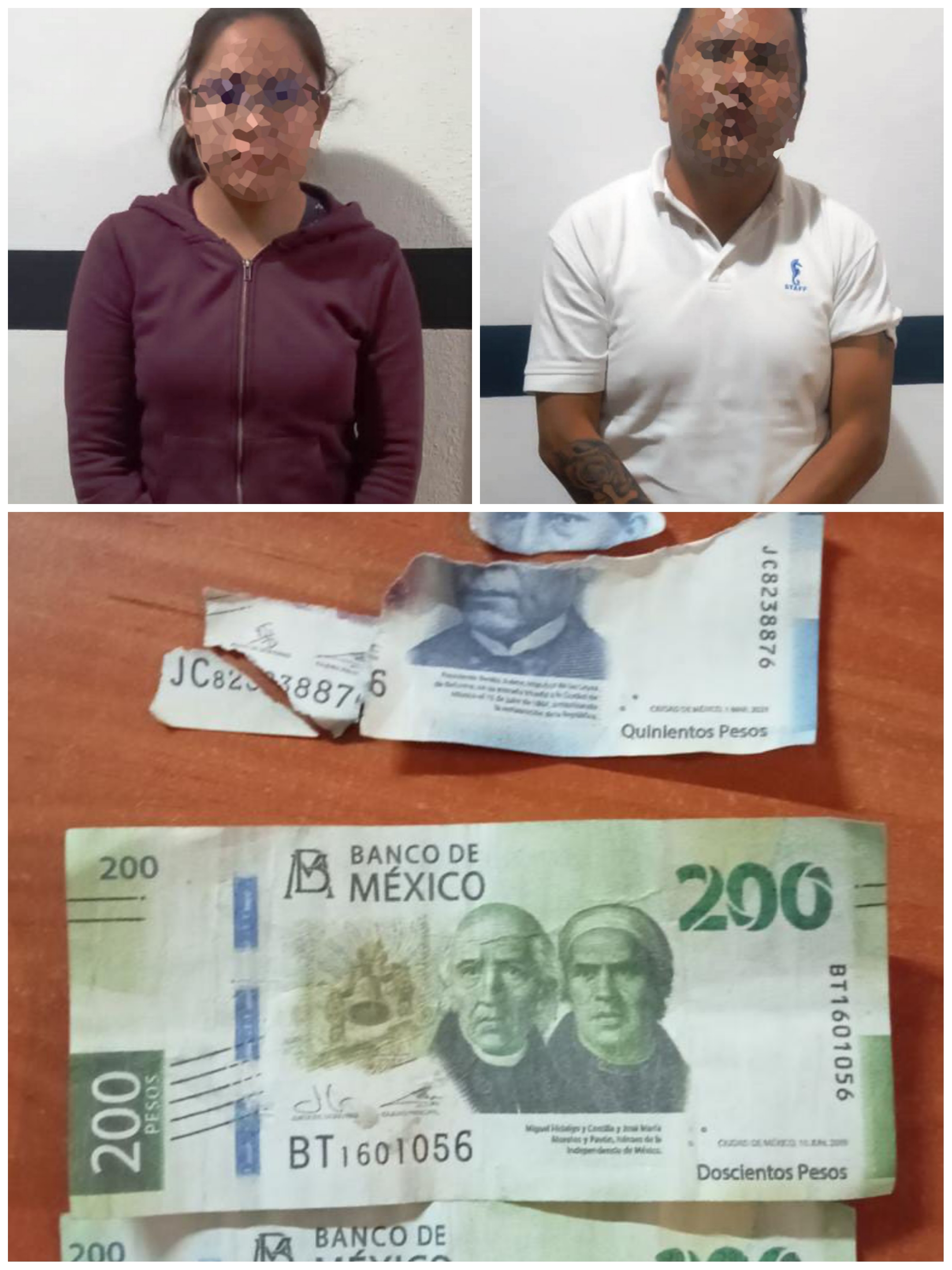 La Secretaría de Seguridad Ciudadana (SSC), detuvo a un hombre y una mujer en el municipio de Ixtenco por su posible participación en el delito de falsificación, luego de asegurar dos billetes con denominación de 200 pesos y uno más de 500, con los cuales realizaban compras.