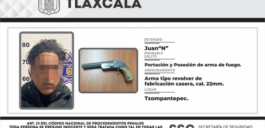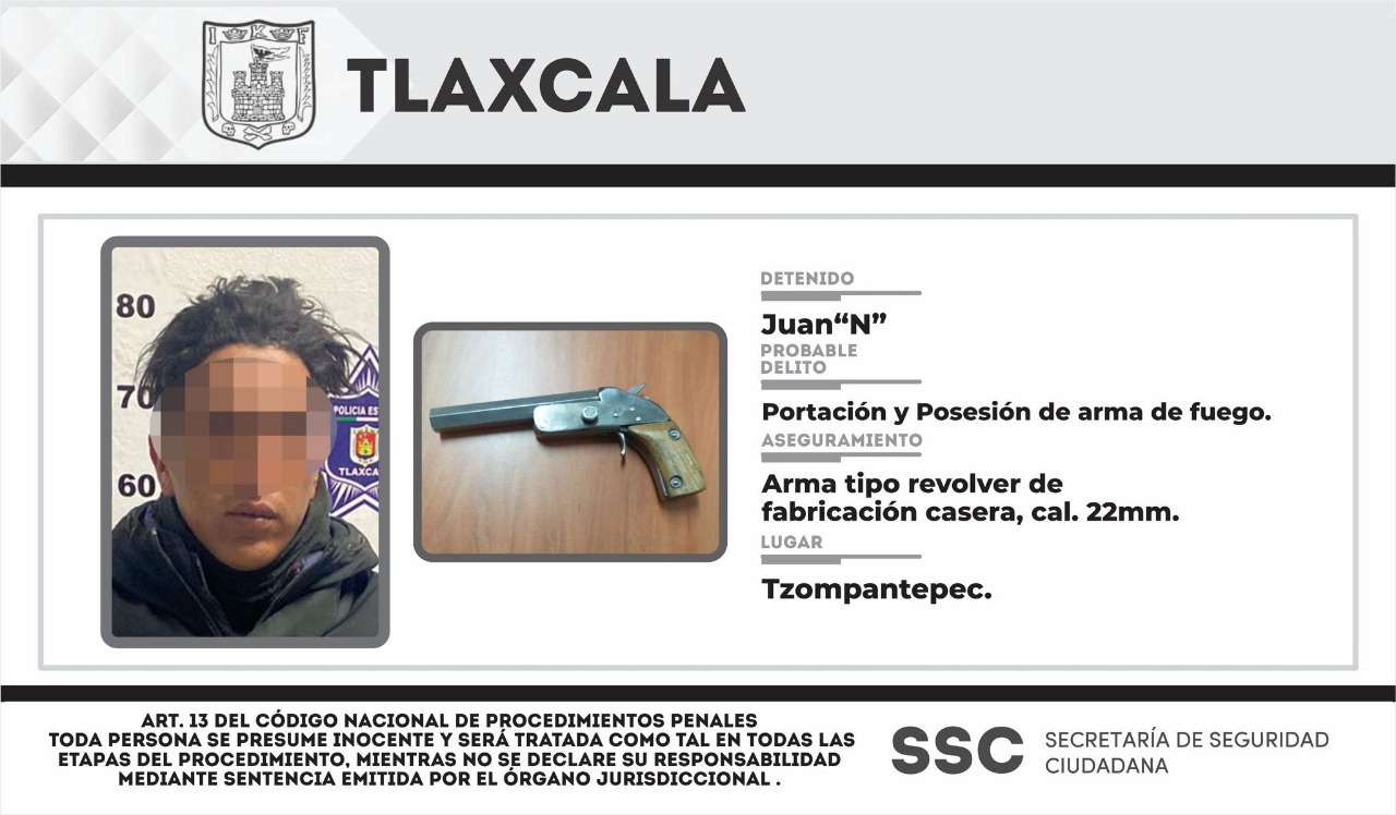 Personal de la Dirección de Seguridad perteneciente a la Secretaría de Seguridad Ciudadana (SSC), detuvo en el municipio de Tzompantepec a una persona que portaba un arma de fuego.