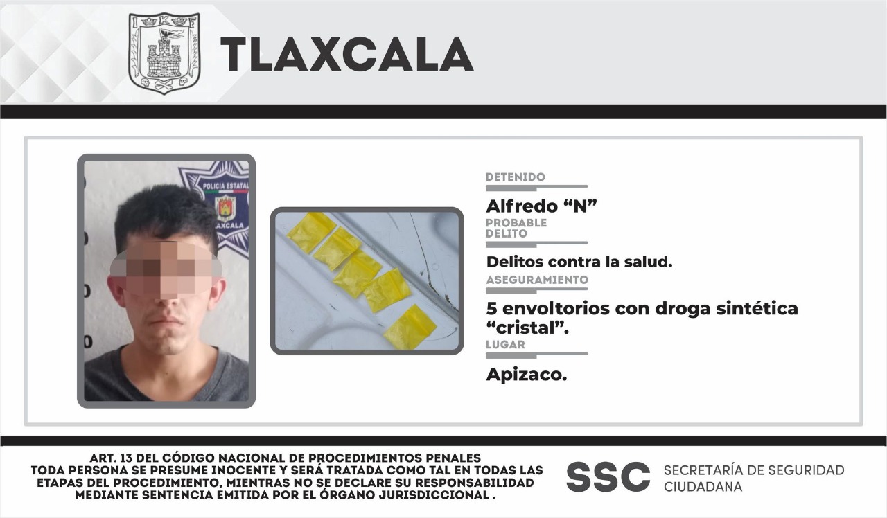 Con el objetivo de combatir y prevenir delitos contra la salud en el estado de Tlaxcala; en su modalidad de narcomenudeo, la Secretaría de Seguridad Ciudadana (SSC) detuvo el día jueves a una persona en el municipio de Apizaco, luego de detectar que portaba sustancias ilegales.