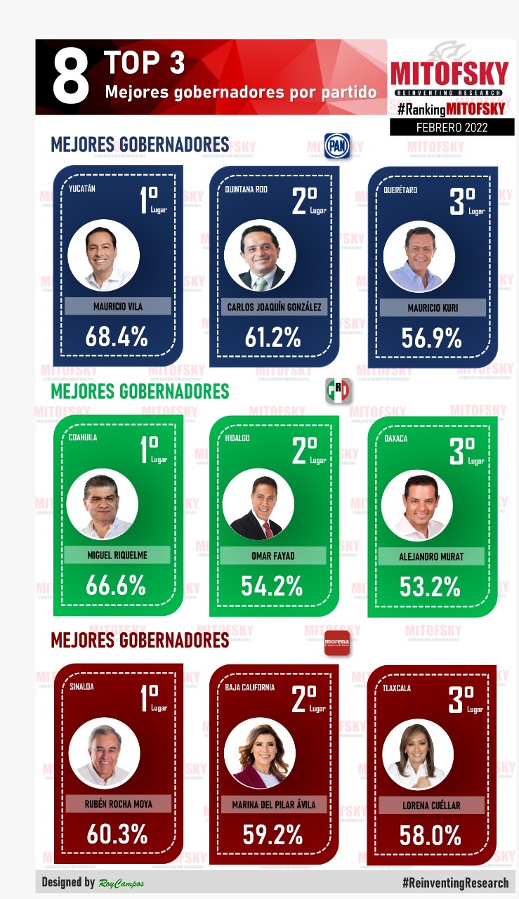 El estudio que realiza de manera mensual la casa encuestadora Mitofsky, difunde el mejor ranking de gobernadores y gobernadoras del país, da a conocer la aprobación que tienen durante todo el mes en cada una de sus entidades federativas, es así que a través de un desglose se reporta la evolución, ascensos o descensos de consentimiento, comportamientos y crecimientos de los mismos y de los partidos políticos.