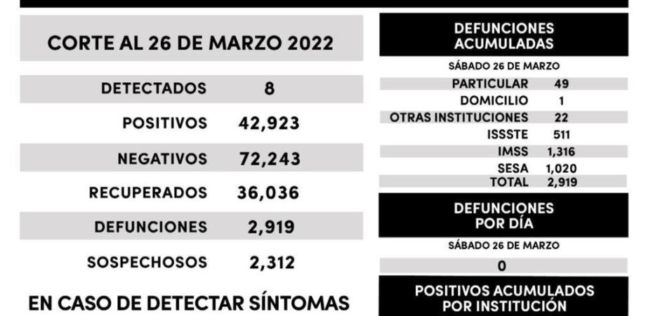 Los datos de la SESA registrados en la plataforma nacional del Sistema de Vigilancia Epidemiológica de Enfermedades Respiratorias (Sisver), confirmaron 8 casos positivos de Covid-19 y cero defunciones, el 26 de marzo de 2022 en la entidad.
