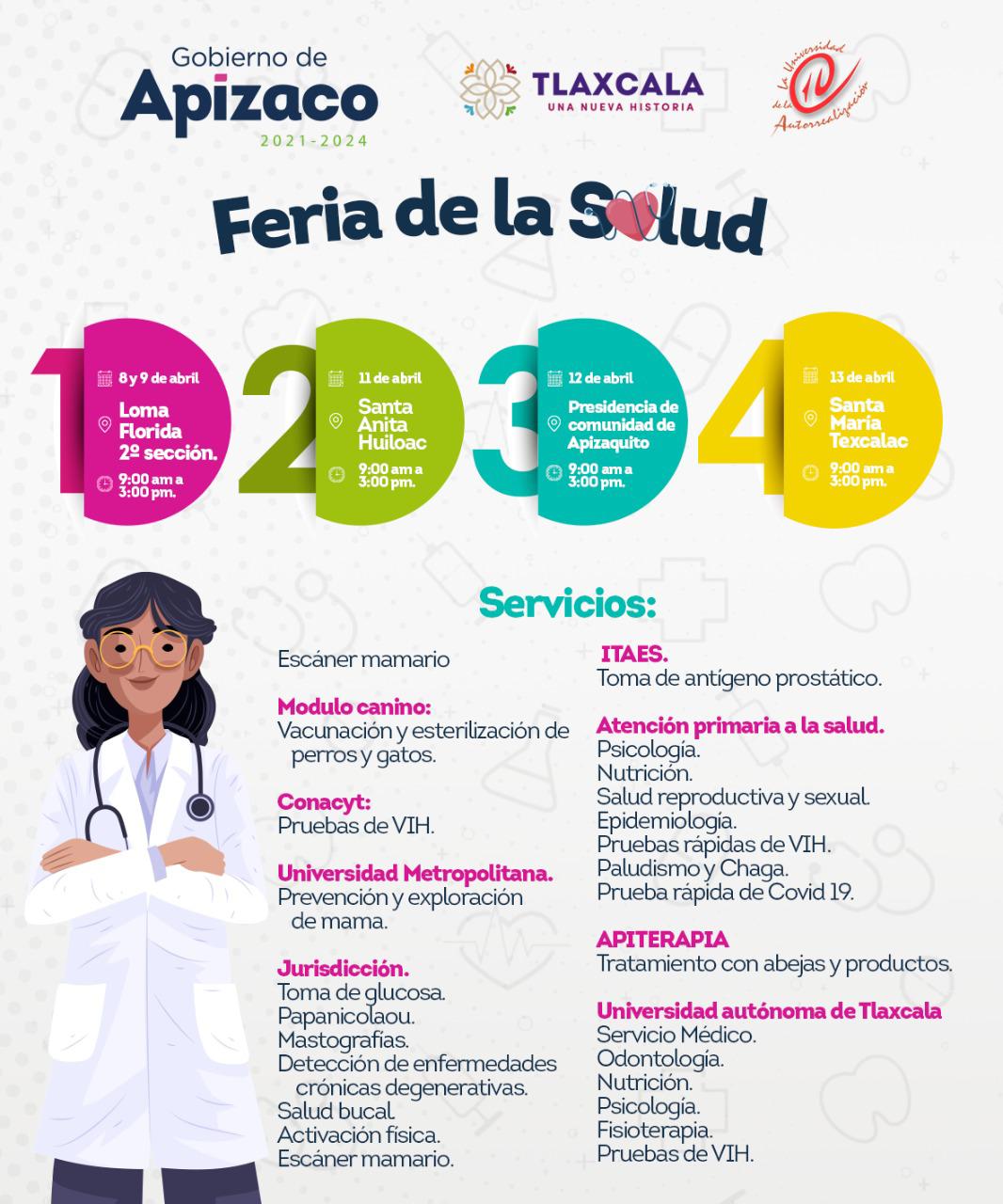 Además, del 8 al 13 de abril se llevará a cabo en cuatro comunidades, una feria de la salud en la que participa el Gobierno del Estado y la Universidad Autónoma de Tlaxcala, para acercar diversos servicios a la población.