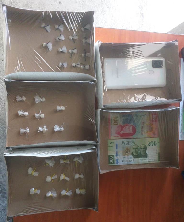 De esta manera los elementos de la SSC, encontraron entre sus pertenencias 22 envoltorios pequeños, que en su interior contienen una sustancia conocida como cocaína y 11 envoltorios pequeños, qué en su interior contiene una sustancia granulada con las características propias de la droga llamada cristal.