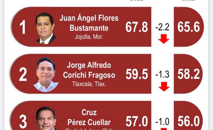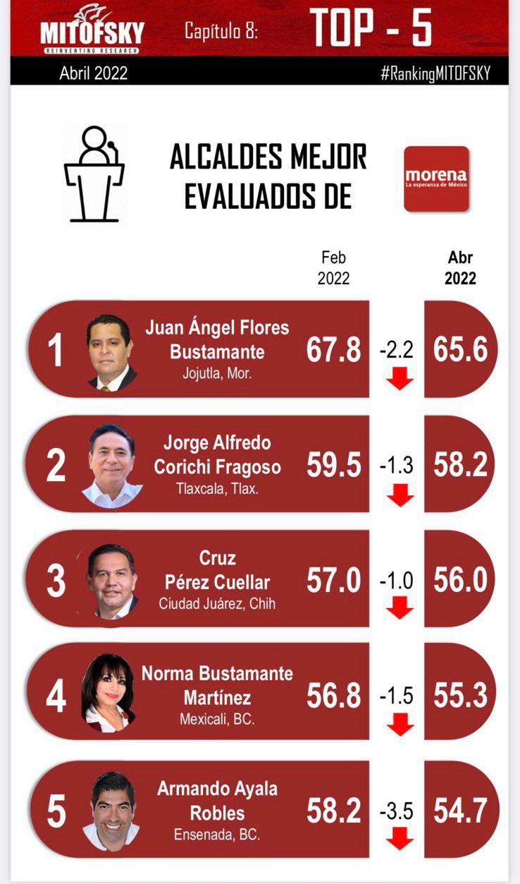 Norma Bustamente Martínez, de Mexicali, Baja California y Armando Ayala Robles, de Ensenada, Baja California, completan el “Top – 5“ de los presidentes municipales de filiación morenista con mejor calificación.