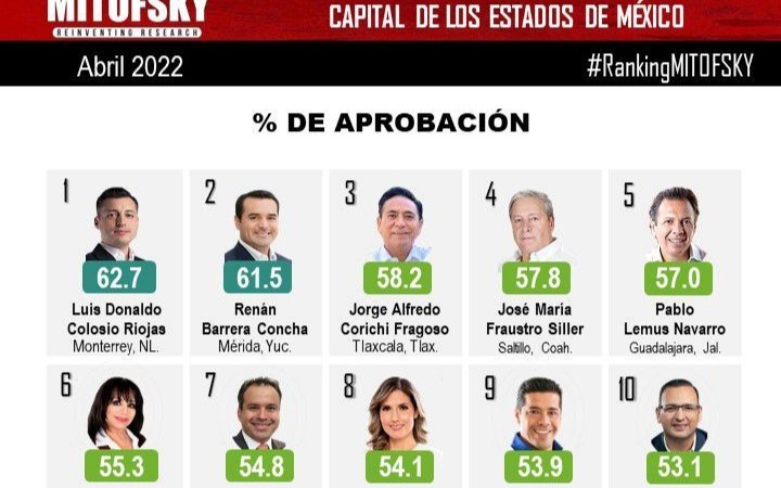 La medición correspondiente al mes de abril sitúa a Jorge Corichi por encima del promedio de los alcaldes de las capitales de los estados de toda la nación que es de 45.1 por ciento.